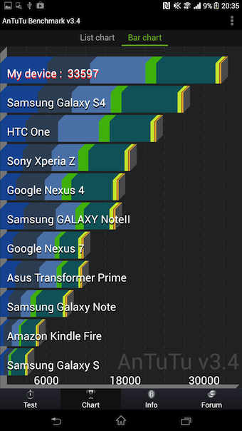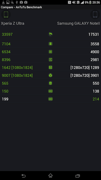 Côté benchmark, le dispositif est passé dans les “mains” de AnTuTu. Sur ce dernier, la phablette a obtenu le score de 33957 points, lui permettant de se placer largement en tête, loin devant le Samsung Galaxy S4. Personnellement j’ai trouvé la navigation de l’interface sur le Xperia Z Ultra vraiment fluide.