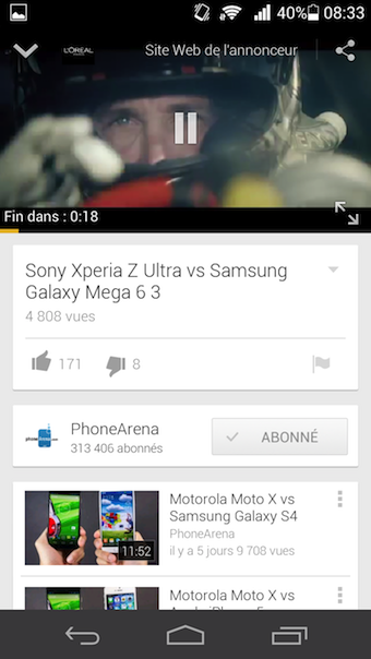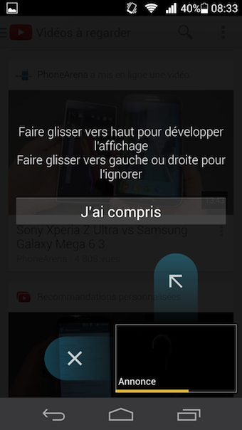 Ainsi, vous commencez par regarder quelque chose dans l’application, puis, glisser votre doigt vers le bas – ou en cliquant sur la flèche présente, la vidéo est alors minimisée en bas à droite de l’écran. De là, vous pouvez aller à la partie centrale et parcourir les autres vidéos. Quand vous trouvez quelque chose que vous souhaitez regarder, appuyez sur la vidéo et celle-ci sera instantanément lue comme d’habitude, interrompant la vidéo précédente. À noter qu’il est bien sûr possible de remettre la “vidéo réduite” à sa taille d’origine en cliquant dessus ou en glissant vers le haut. Pour l’effacer et donc l’arrêter, un balayage vers la gauche ou vers la droite suffit.