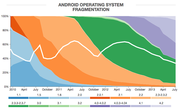 Alors que nous avons tendance à nous plaindre de la fragmentation Android au motif qu’il engendre d’énormes difficultés dans le développement d’applications pour la plateforme – il y a tellement de tailles d’écran, pour ne citer qu’un exemple. Cependant, dans la présentation de ses résultats pour l’année 2013 Open Signal indique le gros avantage de l’existence de tant de différentes versions d’Android est que “pour les consommateurs, l’extrême fragmentation signifie qu’ils peuvent disposer exactement le smartphone qu’ils veulent – grand ou petit, pas cher ou chère, avec un certain nombre de différentes combinaisons de caractéristiques”, tout en soulignant que “la disponibilité des téléphones Android à bas prix (rarement exécutant la version la plus récente) signifie qu’ils ont une portée mondiale beaucoup plus grande que iOS, signifiant que les développeurs d’applications ont un plus large public à nourrir”.