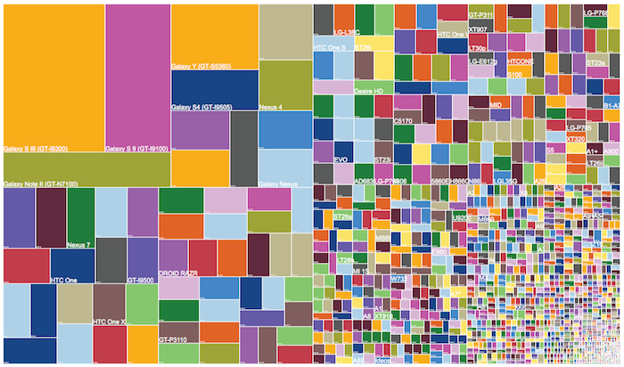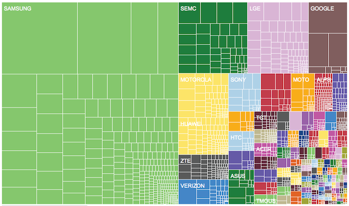 Bien que vous ne serez pas en mesure de lire tous les noms sur l’image postée ci-dessus, le plus grand rectangle (jaune) est le Galaxy S3 (GT-19300) et le deuxième plus important (rose) est le Galaxy S2 (GT-19100). Globalement Samsung détient une part de 47,5% de tous les appareils avec SEMC, LGE, Google, Motorola et Huawei ayant également des parts de marché importants :