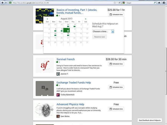 Google présente ce dernier comme “une nouvelle façon de connecter les gens qui ont besoin d’aide avec les personnes qui peuvent apporter une aide, plus de la vidéo en direct, n’importe quand, n’importe où”. Le nouveau service sera lié à Google+ et passera essentiellement par les Hangouts Google+ : pas avec des amis, mais avec des “enseignants”.