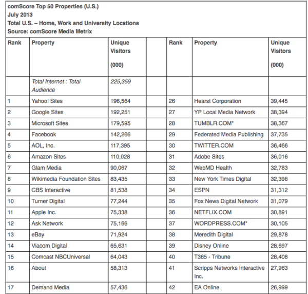 Le coup de pouce de Yahoo provient de son rachat de l’entreprise qui valait 1,1 milliard de dollars, j’ai nommé Tumblr, en mai dernier. Malheureusement pour Yahoo, ComScore n’agrège pas les sites de Tumblr.com pour Yahoo, qui ont tout de même accumulé un total de 300 millions d’utilisateurs et 120 000 nouvelles inscriptions chaque jour, plaçant la plateforme de blogging à la 28ème place de la liste, avec près de 38 millions de visiteurs américains en juillet.