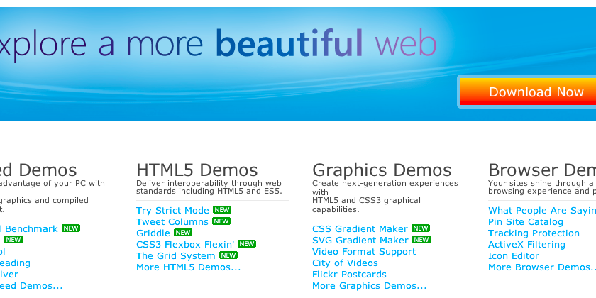 Microsoft a notamment travaillé sur de nouvelles capacités de l’accélération matérielle graphique qu’il avait déjà intégrées dans son précédent navigateur. IE 10 comprendra également le support des standards supplémentaires, comme le CSS3 gradients sur les images de fond et la propriété CSS3 Flexible Box Layout qui permet de construire des layouts entiers de page de manière beaucoup plus naturelle que ce que l’on fait aujourd’hui avec des éléments div en position float.