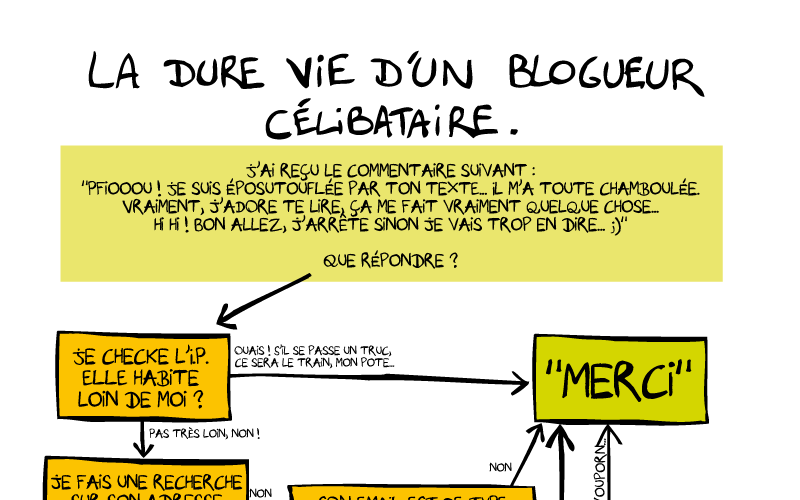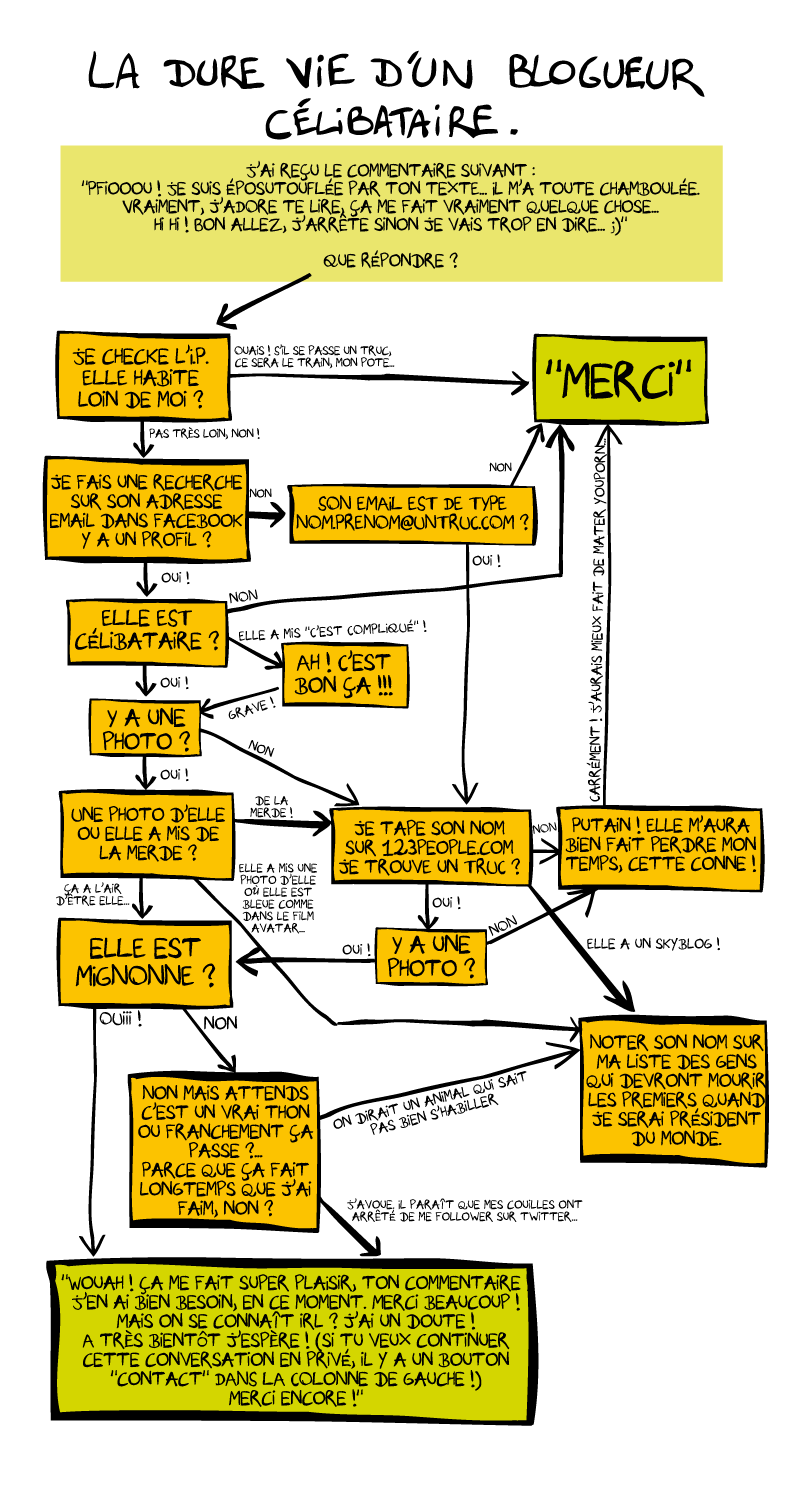 Un petit billet humoristique, puisque je viens de découvrir une illustration très amusante et qui ne me semble pas totalement éloignée de la réalité. Cela concerne les blogueurs célibataires qui reçoivent un commentaire d’une demoiselle sur leur blog (l’histoire nous dira si elle est jolie ou non).