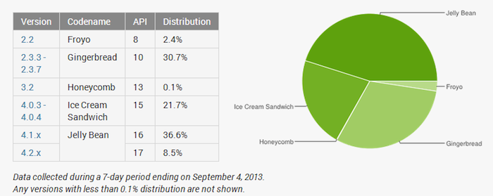La dernière mise à jour du tableau de bord de la page Android Developer de Google montre que, à compter du 5 septembre, les deux versions de Jelly Bean (Android 4.1.x et 4.2.x) représentent 45,1% de tous les appareils Android se connectant au Google Play Store. Le mois dernier, Google a enregistré près de 40,5% de parts de marché pour cette même version.