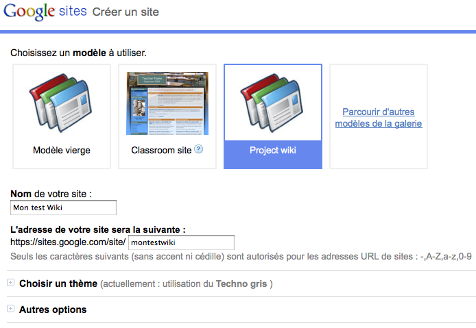 - 1 – Connectez-vous à Google Site avec votre compte Google, puis cliquez sur “créer votre site”. Ensuite, cliquez sur “Parcourir d’autres modèles de la galerie”, choisissez le modèle “Projet Wiki” et enfin appliquez un jeu de couleurs pour votre wiki