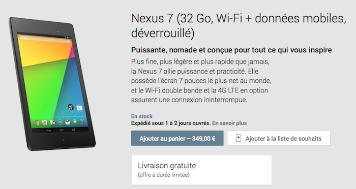 Ainsi, si vous vous rendez dès à présent sur la boutique en ligne, vous pourrez dès à présent commander la Nexus 7 de 32 Go, embarquant les connectivités Wi-Fi et données mobiles, pour un prix de 349 euros, qui est bien sûr plus cher que les modèles Wi-Fi, qui vont de 229 euros (16 Go) et 269 euros (32 Go).