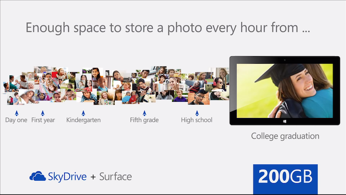 Avec le lancement de Windows 8.1 dans un avenir proche, Microsoft a annoncé une nouvelle option de stockage pour SkyDrive. Le service de stockage sur le cloud, qui est maintenant fortement intégré dans Windows 8.1, offre désormais la possibilité de s’inscrire pour disposer de 200 Go de stockage pour 77 euros par an. Jusqu’à aujourd’hui, la plus grande capacité de stockage que Microsoft offrait était de 100 Go pour 37 euros par an.