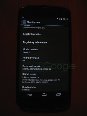 Au cours du weekend, outre le fait que le soleil était présent sur toute la France et que nous avons été champion d’Europe de basket, un petit malin a envoyé à divers blogs outre-Atlantique une série de clichés, de ce qu’il, ou elle d’ailleurs, prétend être Android 4.4 KitKat. Selon cet informateur anonyme, la version est accessible sur la Nexus 4 d’un ami.