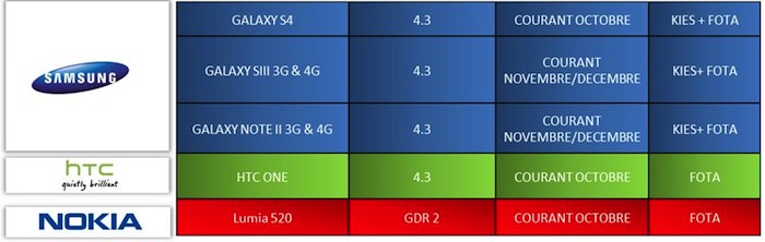 - Galaxy Note 2 (3G et 4G) : mise à jour Android 4.3 en novembre/décembre via Kies et OTA