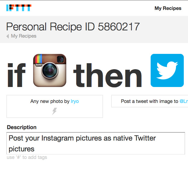 Comme le service fait parti de la grande guère actuelle sociale, il n’est pas improbable qu’Instagram ne commence pas à supporter les Twitter Cards de sitôt, et c’est pourquoi Michael Calore, a généreusement partagé son hack pour contourner ce problème, impliquant l’utilisation de Tumblr. Mais si vous utilisez un service nommé IFTTT, il y a une solution encore plus simple que cela.