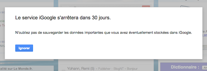 Google a annoncé en juillet 2012, dans la période sombre des annonces brutales de la fermeture de divers services – je pense bien évidemment à Google Reader – qu’elle allait tout simplement stopper et fermer iGoogle, dans le cadre de l’un de ses “nettoyage de printemps”. Google a révélé qu’il allait rendre indisponible iGoogle pour tous, le 1er novembre 2013, qui à ce jour est très proche d’arriver.