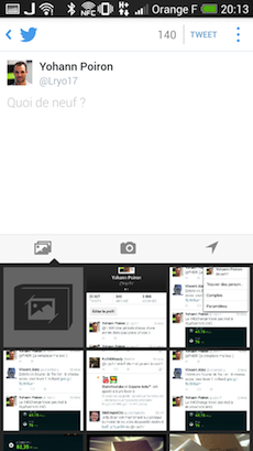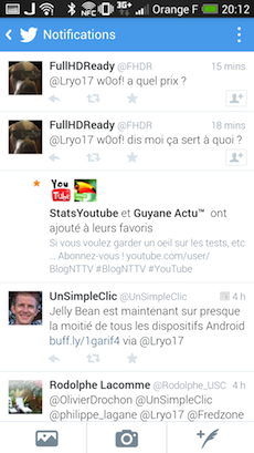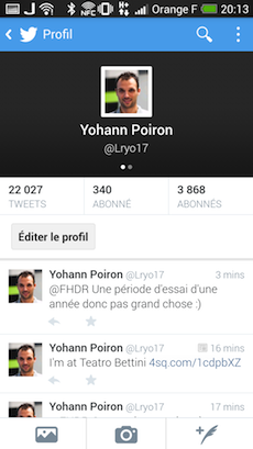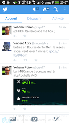 Si le style général est toujours le même, les onglets ont été considérablement réduits, puisque l’on retrouve seulement : Accueil, Découvrir et Activité. Un certain nombre de fonctionnalités ont été transplantées dans la barre d’action, comme les messages privés et les notifications. Gardez à l’esprit que la zone de notification est l’endroit où toutes les réponses se trouvent, et il peut paraître bizarre de les retrouver dans une barre d’action. Le bouton de composition permettant de poster un nouveau tweet a été retiré de la barre d’action pour faire de la place, et se retrouve maintenant dans une barre de boutons flottants semi-transparents au bas de l’écran avec des liens vers la caméra et la galerie.