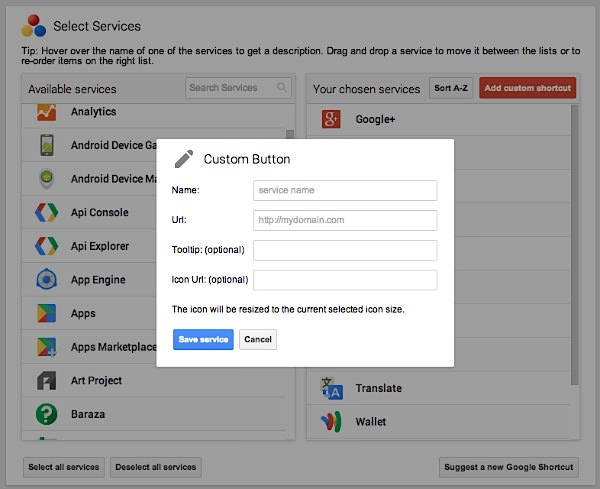 Lorsque vous cliquez sur le lien “Configure”, une fenêtre permettant d’accéder à diverses options s’affichera. Ici vous pouvez ajouter et supprimer des services du lanceur (via du glisser-déposer), réorganiser vos services choisis et ajouter des raccourcis personnalisés – vous pouvez même ajouter une info-bulle en option et/ou une icône. Vous remarquerez également que si une fois que vous allez au-delà de 12 services, votre grille va commencer à croître pour répondre à vos nouvelles “applications”. Good Bye les plusieurs pages !
