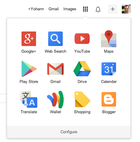 Pour commencer, installez l’extension – disponible depuis ce lien – et visitez votre service web Google préféré (ex. Google Recherche). Cliquez sur l’icône du lanceur d’applications et vous verrez alors désormais une grille 3 × 4, ainsi qu’un lien “Configure” en bas du lanceur.