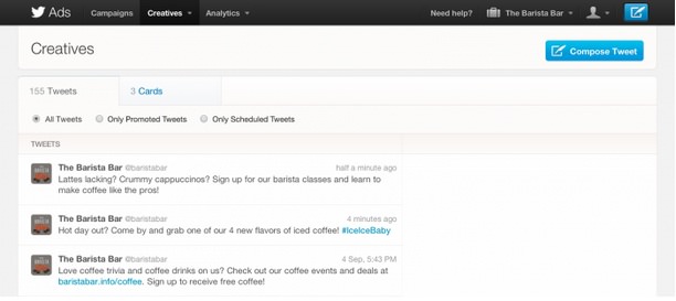 Pour ce faire, si vous allez sur le bouton bleu Tweet en haut du site ads.twitter.com, afin de créer et planifier un tweet. Il y a un nouveau menu nommé “Creatives” que vous pouvez utiliser pour créer et gérer des tweets programmés, ainsi que les cartes Twitter.