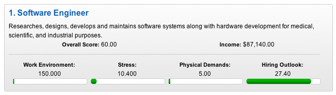 A proliferation of companies making applications for smartphones and tablets, along with the push to develop ‘cloud’ software hosted entirely online, has made the job market for software engineers broader and more diverse. And a diverse job market brings improvements in stress factors such as growth potential and competitiveness, as workers become less beholden to employers or vulnerable to outsourcing. In fact, the stress ranking for software engineer improved 10 spots this year, jumping from 25th to 15th place overall. [CareerCast]