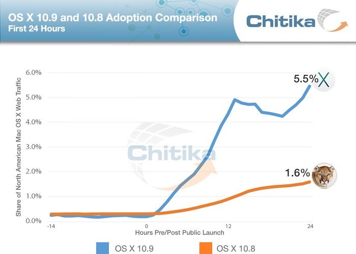 Selon les données exposées par Chitika, une société qui recueille de nombreuses informations, la nouvelle version du système d’exploitation de bureau d’Apple, OS X Mavericks, a augmenté de 5,5% sur le trafic Internet aux États-Unis et au Canada dès le premier jour.