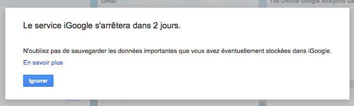 Malheureusement pour eux, iGoogle va officiellement disparaître dans les deux prochaines journées. Si vous y allez aujourd’hui, en cliquant sur ce lien par exemple, vous verrez ce message :