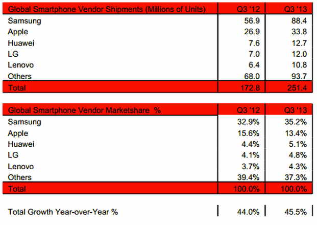 Incroyable décompte pour Samsung qui donne à la firme sud-coréenne une part de près 28% du marché de la téléphonie mondiale, selon Strategy Analytics, contre 26% à cette même époque l’an dernier. Nokia traîne avec 15%, en baisse par rapport aux 21% de l’année dernière. En troisième lieu, il s’agit d’Apple, en hausse, passant de 7% en 2012 à 8% aujourd’hui. LG a également fait des progrès, grâce à sa décision d’inclure l’Europe quand il lance un nouveau dispositif, et a augmenté ses ventes pour atteindre un peu plus de 4% de parts du marché mondiale. Huawei a réalisé des gains modestes, mais occupe toujours la cinquième place avec une part de 3%.