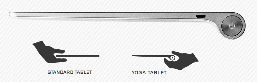 Alors que la plupart des tablettes essayent d’être aussi minces que possible, Lenovo a décidé de ne pas jouer sur ce secteur. Empruntant un peu d’inspiration à Sony, notamment avec l’ancienne Xperia Tablet S, la tablette Yoga dispose d’un cylindre assez épais sur le dessous/côté (selon la façon dont vous souhaitez tenir la tablette), qui est censé faciliter la prise en main pour la lecture.