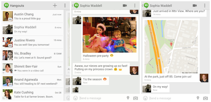 Comme Google l’a annoncé en début, la firme de Mountain View a unifié complètement la messagerie, qu’il s’agisse du chat, mais également des SMS ou encore des MMS, tout passe désormais par l’application Hangouts. Elle remplace l’application de messagerie par défaut, et permet d’envoyer un SMS comment vous le faisiez auparavant à un numéro ou à quelqu’un dans votre carnet d’adresses.