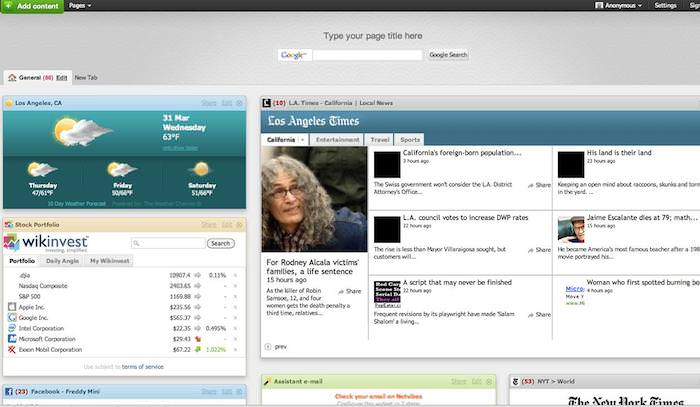 Un des tableaux de bord les plus puissants qui se différencie en divisant votre point de vue en deux volets, est Netvibes. L’un est dédié aux widgets, et l’autre pour le flux de news. Le nombre d’options peut rendre Netvibes intimidant, mais il aide à soulager la douleur de l’installation avec un certain nombre d’options préconfigurées mis en place à des fins différentes. Il y a même un modèle pour les personnes qui migrent de iGoogle. Les options abondantes pour la personnalisation signifie également que vous pouvez modifier l’apparence de votre tableau de bord pour qu’il soit juste à votre goût, même si ce ne sera pas tout à fait aussi attrayant que My Yahoo.
