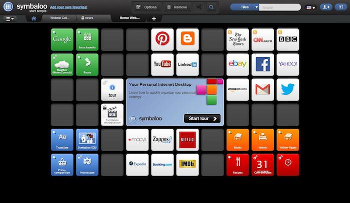 Symbaloo s’adresse aux personnes ayant besoin d’un visuel, avec une grille géante d’icônes organisées autour d’une dalle plus grande au centre. Plutôt que de vous surcharger avec une page tentaculaire avec texte dense, vous cliquez sur une icône et automatiquement cela va changer la tuile centrale pour afficher les informations provenant de ce “service”, comme votre horoscope ou un outil de comparaison de prix. Alors qu’il semble plus joli que les tableaux de bord vus jusqu’ici, voici une conception assez originale !