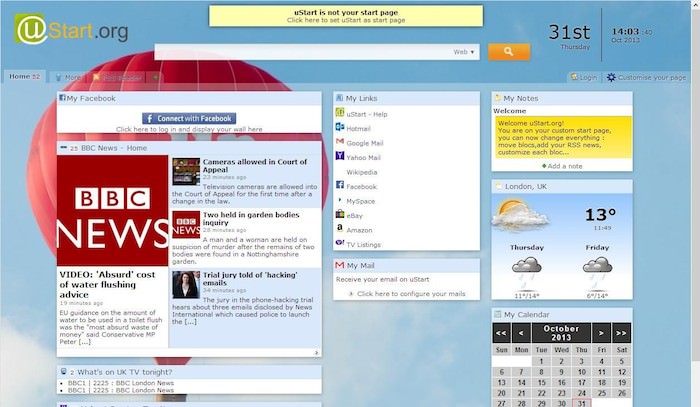La possibilité d’importer des paramètres à partir de iGoogle fait de Ustart une option tentante pour fuir iGoogler, mais en pratique, il ne fonctionne pas bien : le seul widget transféré avec succès en ce qui me concerne, était la météo. Contrairement à igHome, vous ne retrouverez pas la barre de lien vers les services de Google. Cela dit, je pense que c’est le plus beau des sosies de iGoogle, grâce à une touche de design minimaliste. Dommage que vous ne pouvez pas abandonner le laid logo de Ustart dans le coin supérieur gauche. Et ne cherchez pas les gadgets intelligents : Ustart offre seulement les bases, comme la météo, Facebook ou encore vos mails.