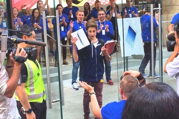 Pocket-lint nous montre en photo ce qui semble être le premier acheteur de l’iPad Air dans le monde. Le jeune garçon sort du magasin montrant sa nouvelle tablette à une foule en délire, à la presse et avec un personnel d’Apple dans le fond pour applaudir ce dernier d’avoir déboursé au moins 600 euros !
