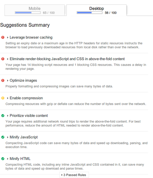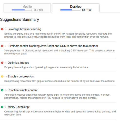 Les suggestions sont évidemment la partie la plus importante de ce projet. Pour la plupart des sites, Google vous recommandera probablement d’utiliser le cache du navigateur de façon plus agressive, en éliminant du code JavaScript et en optimisant ou en compressant les images.
