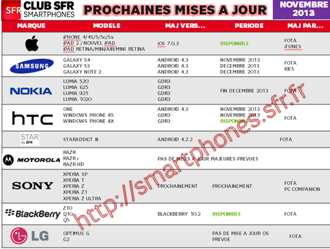 Concernant le LG G2, l’opérateur mobile français SFR a révélé sur sa page de mise à jour des OS des smartphones, que le LG G2 sera mis à jour vers Android 4.4 KitKat dans les prochaines semaines. Sans donner une date de mise à jour réelle, SFR a indiqué que “novembre ou décembre 2013” était la période prévue pour la mise à jour vers KitKat pour le smartphone phare de LG, sur lequel le Nexus 5 est largement basé.