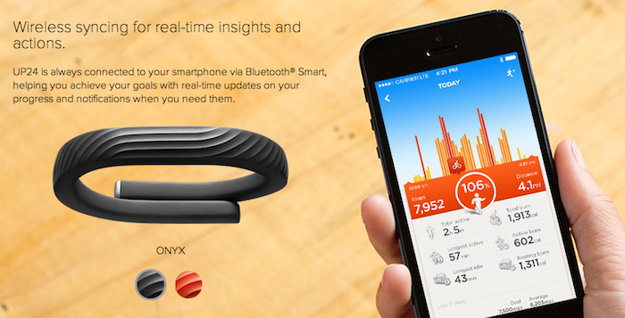 Si l’on s’arrête à son aspect et son design, l’UP24 est essentiellement identique à la génération précédente. C’est la même chose, un bracelet qui vient se positionner autour de votre poignet. Mais, maintenant celui-ci est équipé de la technologie Bluetooth 4.0, de sorte que le UP24 va finalement envoyer les données en temps réel sur votre iPhone (et “bientôt” sur votre smartphone Android), ce qui signifie que vous pourrez disposer d’informations plus détaillées dès que bon vous semble. C’est une bonne chose, mais cet ajout peut clairement faire office d’un rattrapage suite à un manque flagrant de l’ancien opus. Il n’y a toujours pas d’écran, ou tout autre moyen permettant de voir vos progrès sur le UP lui-même, et il n’y a toujours pas d’altimètre.