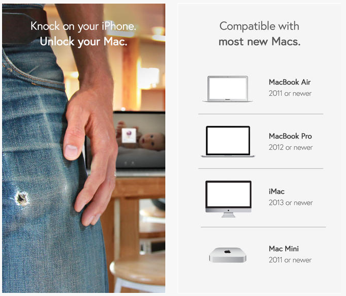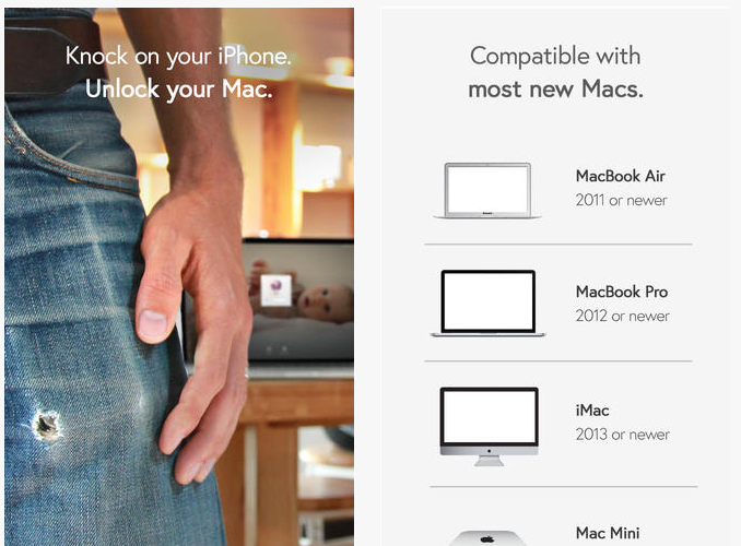 Arrivé sur l’App Store il y a quelques jours, cette nouvelle application intelligente nommée Knock, vous permet de déverrouiller votre Mac simplement en « interagissant » avec votre iPhone. En effet, en utilisant une connexion Bluetooth LE, votre téléphone communique avec votre ordinateur et sait quand vous êtes à proximité. Si vous vous éloignez et que vous êtes hors de portée, votre ordinateur se verrouille automatiquement derrière vous. Lorsque vous revenez, vous n’avez même pas besoin de sortir le smartphone de votre poche – il suffit de taper deux fois dans votre poche et votre ordinateur va par magie se déverrouiller.