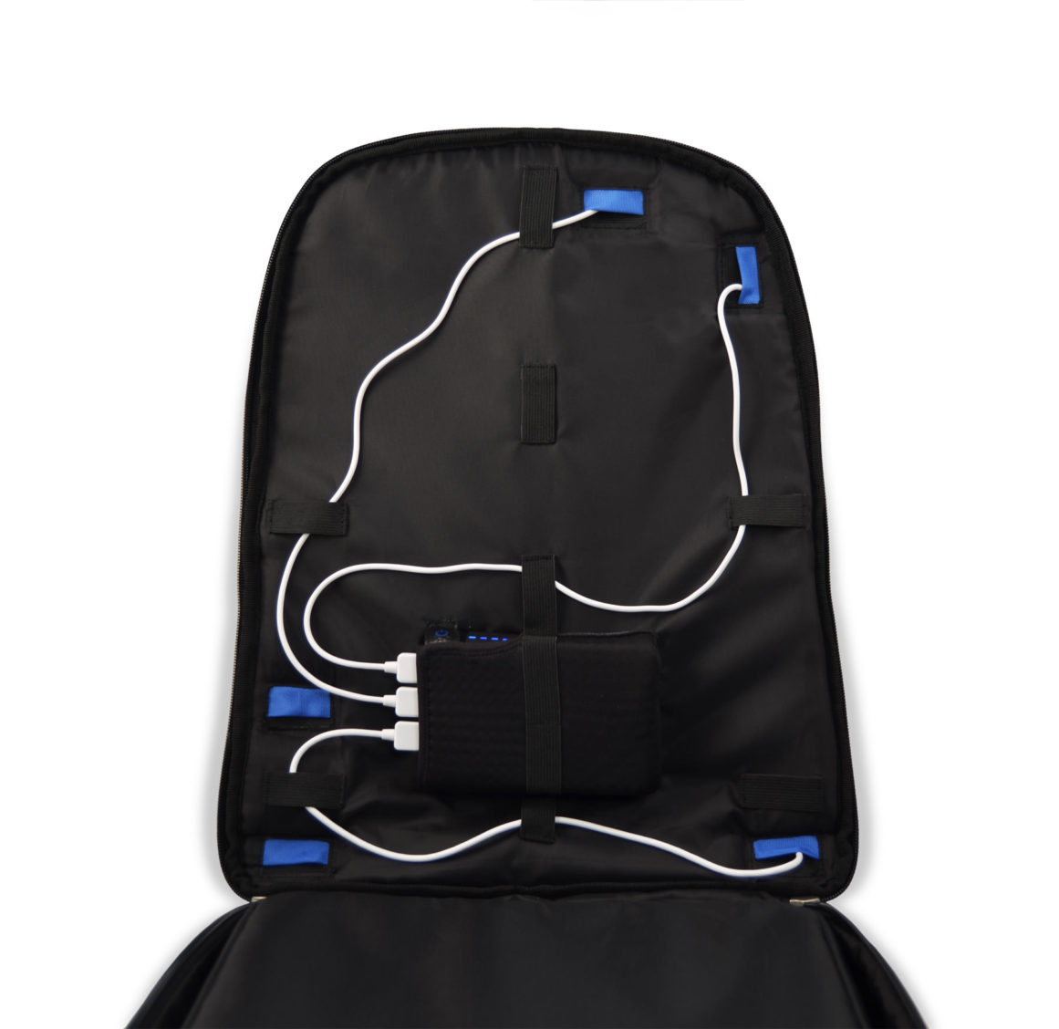 Mais il va encore plus loin que cela, puisque le sac à dos dispose d’un système intégré de câblage permettant d’alimenter les objets dans le sac et ainsi pouvoir marcher sans que tout soit en vrac. En effet, Tylt a conçu un système complet, de sorte que vous pouvez parfaitement emmener les câbles à l’une des 5 poches extérieures et aux 2 poches intérieures très facilement. C’est assez intelligent !