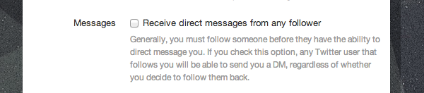 Traditionnellement, pour envoyer à quelqu’un un message direct, cette personne devait vous suivre, ce qui signifie que pour une conversation privée qui aura lieu sur Twitter, deux utilisateurs devaient se suivre réellement l’un à l’autre. Cela a changé avec l’expérience, lorsque Twitter a ajouté à la configuration :