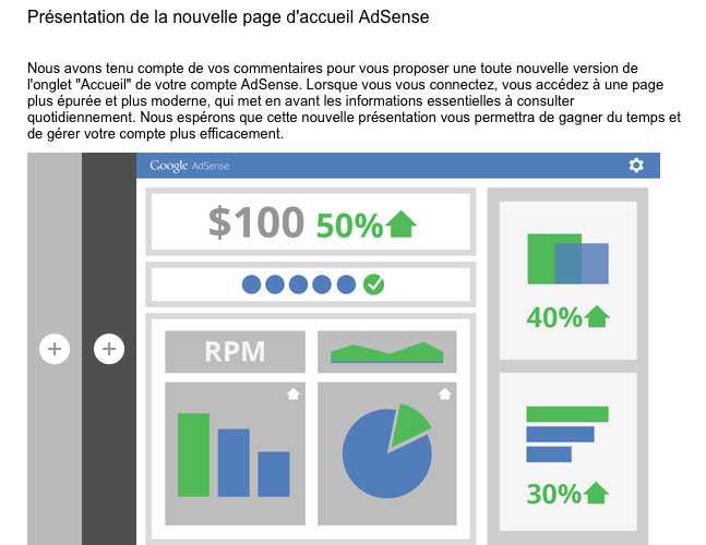 Si je vous en parle aujourd’hui ce n’est pas vraiment pour vous décrire le service, Google le fait bien mieux que moi, mais plutôt pour avertir qu’une nouvelle conception pour la page d’accueil de AdSense semble actuellement être poussée aux utilisateurs, même s’il me semble qu’il s’agit d’un déploiement progressif puisque je vois peu d’articles à ce sujet.