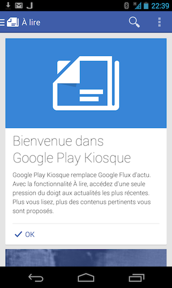 L’application, nommée Google Play Kiosque, et qui est assez similaire à Flux d’actu, est maintenant disponible sur le Play Store. Pour les utilisateurs dans les pays où l’application Play Magazines est disponible sur la boutique, c’est-à-dire aux États-Unis, au Canada, au Royaume-Uni et en Australie, cette dernière va se mettre à jour et changer son nom pour Newsstand – le nom donné à Play Kiosque dans la langue de Shakespeare, tandis que dans le reste du monde, autrement dit sur le territoire Français, l’application va coexister (au moins pour l’instant) avec Flux d’actu.