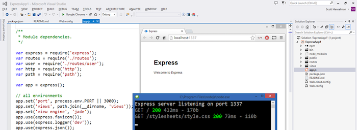 Node.js permet aux développeurs d’écrire leurs applications côté serveur en JavaScript et il semble que Microsoft a gardé tous les éléments essentiels de ce processus. En tant que membre de la team de la plateforme web de Microsoft, Scott Hanselman, note que l’équipe a décidé de ne pas “re-faire des choses qui ont déjà bien fonctionné”. Les outils utilisent l’exécutable standard node.exe et le débogueur V8 (Node.js utilise le moteur d’exécution ultrarapide V8 de Google Chrome), par exemple.