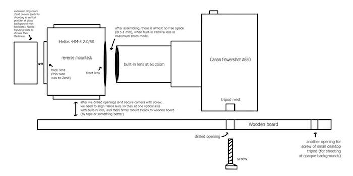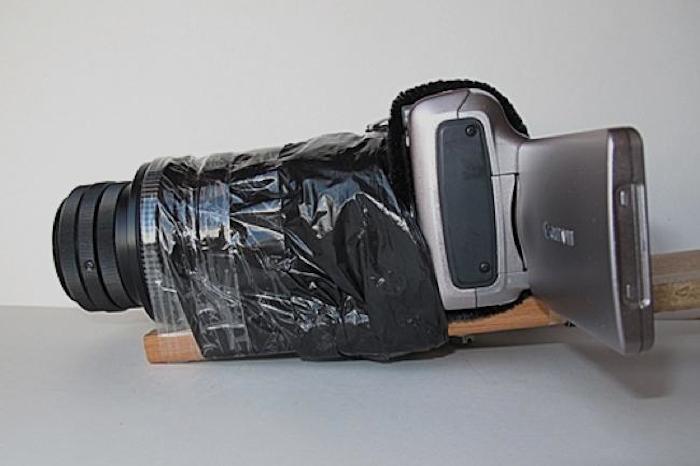 En effet, Alexey Kljatov a assemblé deux pièces bon marché de matériel photographique – un Helios-44 avec un objectif 58mm f/2 de l’ère soviétique, et un vieillissant mais peu cher Canon PowerShot A650 de 12.1 mégapixels, en utilisant une planche de bois, du ruban adhésif, une vis, et un morceau de verre.