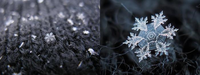 “Je capture des flocons de neige sur le balcon ouvert de ma maison, la plupart du temps sur la surface vitrée, éclairée par une lampe de poche LED du côté opposé de la vitre, et parfois à la lumière naturelle, avec des tissus de laine sombre comme toile de fond”, écrit Kljatov sur son blog, détaillant le processus qu’il a mis en œuvre. Le Canon est réglé sur le mode macro et en pleine résolution, et sur un retardateur. Pendant la durée de la temporisation, Kljatov utilise une lampe de poche à travers deux couches d’un sac en plastique, afin de créer un éclairage plus uniforme, dit-il. L’ensemble du processus fonctionne que ce soit en journée et la nuit, même avec un ISO au minimum et peu de temps d’exposition.