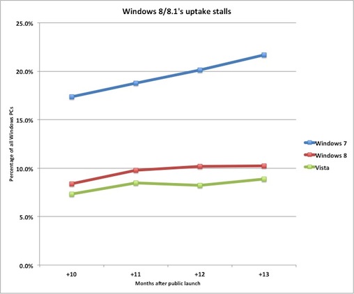 C’est sans grande révélation que Windows 8 et Windows 8.1 ont connu une adoption très lente, et que la majorité des utilisateurs sont encore massivement à la fois sur Windows 7 et sur Windows XP.