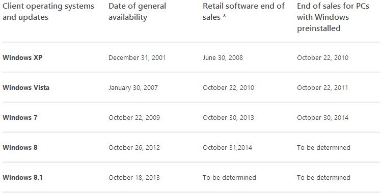 En outre, cela ne veut pas dire que les fabricants de PC seront obligés de cesser de vendre des ordinateurs qui offrent Windows 7. Selon la roadmap de Windows, la date de la cessation de toutes les ventes de PC avec Windows 7 pré-installé sur le périphérique est actuellement indéterminée. Microsoft avait précédemment marqué cette date comme étant le 31 octobre 2014, mais la firme a retiré cette information aujourd’hui.
