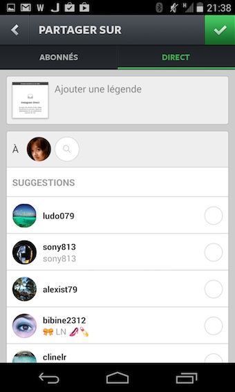 Direct vous permet de spécifier des utilisateurs Instagram. Par défaut, l’application affiche une liste de comptes proposés que vous suivez déjà, mais il est également possible de rechercher et de sélectionner n’importe quel utilisateur connecté à Instagram.