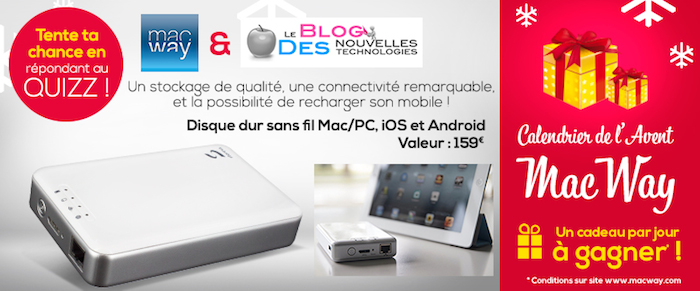 Mais, pour ce premier concours celui-ci déroge un peu à la règle puisque MacWay organise depuis le 2 et ce jusqu’au 20 décembre son calendrier de l’Avent avec un cadeau à gagner par jour ! Aujourd’hui pour tenter de remporter un disque dur externe 2,5″ qui permet de partager ses données entre différents périphériques, les participants devront répondre à un quizz spécialement concocté par mes soins pour l’occasion, mais ça j’y reviendrais à la fin de l’article.
