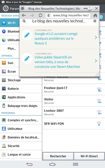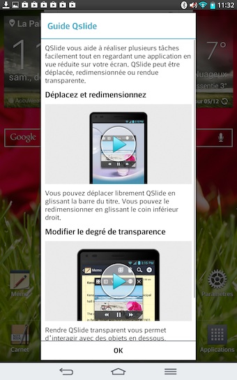 Toutes les fonctionnalités de base de LG sont ici. QSlide vous permet d’ouvrir des mini applications au-dessus de votre écran d’accueil et de manipuler le degré de transparence de leur apparition. Outre celle-ci, QuickMemo vous permet de dessiner sur l’écran avec votre doigt, ou encore la nouvelle fonctionnalité KnockOn de LG, qui vous permet une fois l’écran verrouillé de le déverrouiller en tapant deux fois sur l’écran. KnockOn est un petit, mais incroyablement utile moyen de transformer votre tablette sans avoir à toucher le bouton on/off.