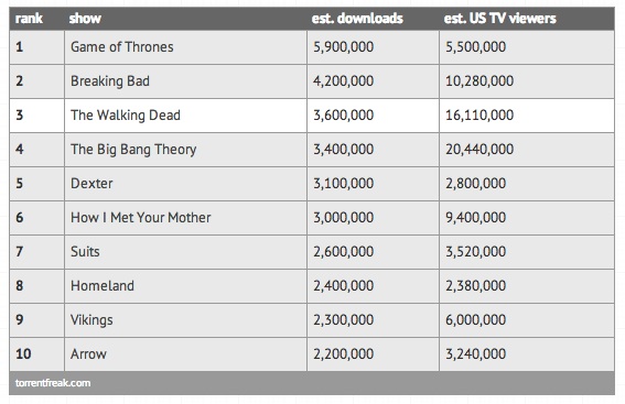 La série a été téléchargée environ 5,9 millions de fois, dépassant la proportion des téléspectateurs “classiques”, qui étaient de 5,5 millions. C’est une augmentation de 37% par rapport à 2012, quand Torrent Freak avait estimé que Game of Thrones avait été téléchargé à près de 4,28 millions de fois.