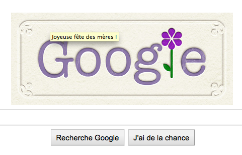 Il n’y a pas que moi qui souhaite une bonne fête aux mamans. Google nous propose un Doodle non animé sur la page d’accueil de son moteur de recherche qui représente le mot Google avec une fleur violette à la place du “L”. Intitulé « Joyeuse Fête des mères ! » le Doodle nous emmène directement sur sa page de résultats.
