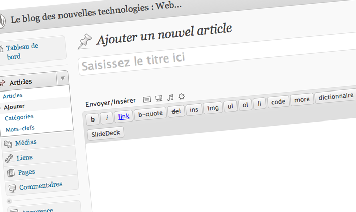 Tu es blogu(euse)eur, ou tout simplement passionné(e) par les Nouvelles Technologies, le Web et la Programmation ? Dans ce cas le Blog des nouvelles technologies te propose de devenir l’un de ses rédacteurs…