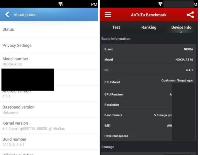 Outre ces captures, un Nokia A110 fonctionnant sous Android 4.4.2 aurait fait surface sur AnTuTu. Si tout ceci s’avère officiel, alors le A110 disposerait d’un appareil photo de 5 mégapixels, d’un écran offrant une résolution de 854 x 480 pixels, et un processeur Snapdragon, qui semblent des caractéristiques plausibles pour un smartphone d’entrée de gamme comme pourrait être le Normandy.
